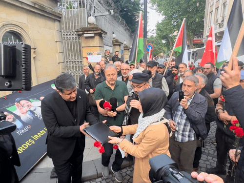 تعداد زیادی از مردم شهر استانبول با حمل تصاویر شهدای خدمت جمهوری اسلامی ایران، در مقابل سرکنسولگری کشورمان در این شهر تجمع نموده و با اهدای شاخههای گل، به این شهیدان ادای احترام کردند.